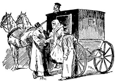 На углу Гороховой – единственный извозчик, старик, в армяке, подпоясанном обрывками вылинявшей вожжи, в рыжей, овчинной шапке, из которой султаном торчит кусок пакли. Пузатая мохнатая лошаденка запряжена в пошевни – низкие лубочные санки с низким сиденьем для пассажиров и перекинутой в передней части дощечкой для извозчика. Сбруя и вожжи веревочные. За подпояской кнут.