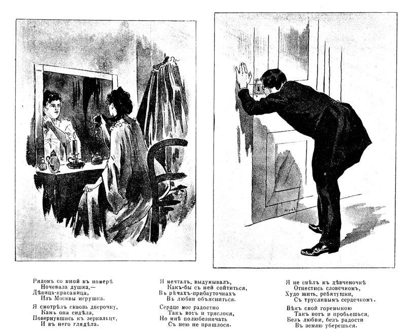 Оригинальные меблирашки! Узенькие, вроде тоннеля, коридорчики, со специфическим «нумерным» запахом. Коридорные беспрерывно неслышными шагами бегали с плохо луженными и нечищенными самоварами в облаках пара, с угаром, в номера и обратно… В неслышной, благодаря требованию хозяина, мягкой обуви, в их своеобразной лакейской ловкости движений еще чувствовался пережиток типичных, растленных нравственно и физически, но по лакейской части весьма работоспособных, верных холопов прежней помещичьей дворни.