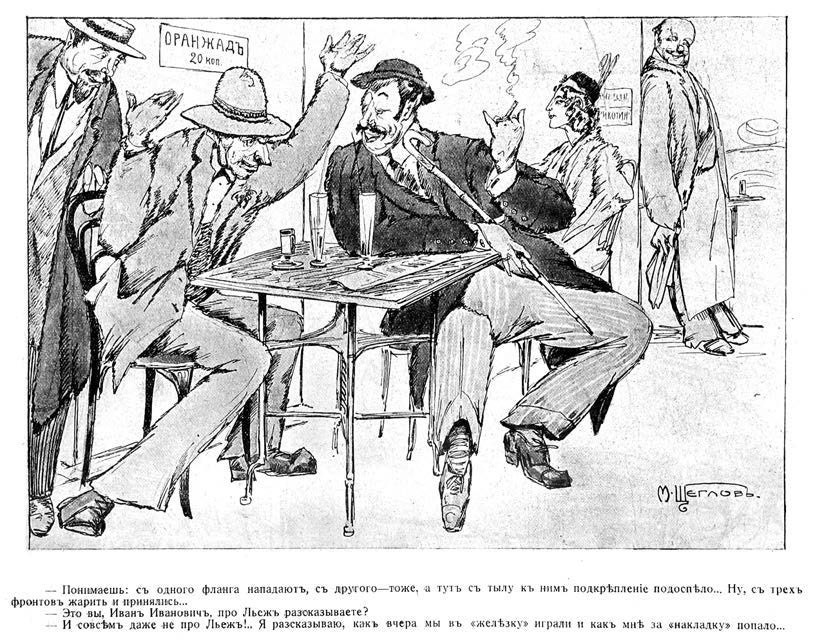 Вспоминается один случай. Как-то незадолго до японской войны у окна сидел с барышней ученик военно-фельдшерской школы, погоны которого можно было принять за офицерские. Дальше, у другого окна, сидел, углубясь в чтение журнала, старик. Он был в прорезиненной, застегнутой у ворота накидке. Входит, гремя саблей, юный гусарский офицер с дамой под ручку. На даме шляпа величиной чуть не с аэроплан. Сбросив швейцару пальто, офицер идет и не находит места: все столы заняты… Вдруг взгляд его падает на юношу-военного. Офицер быстро подходит и становится перед ним. Последний встает перед начальством, а дама офицера, чувствуя себя в полном праве, садится на его место.