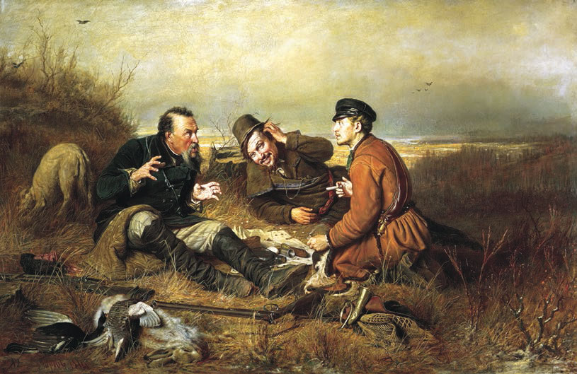 Дмитрия Павловича Кувшинникова, заядлого охотника, запечатлел на своей картине «Охотники на привале» (слева) художник В. Г. Перов.