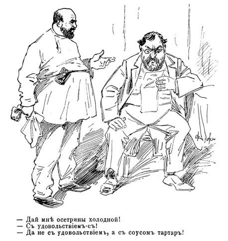 Закрыта кухня, закрыт буфет, и служит самолично только единственный хозяин ресторана, Василий Яковлевич, чуть не молившийся на каждого из посетителей малого зала… Подавались только водка, пиво и холодные кушанья. Пивали иногда до утра.