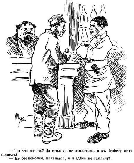 Гостинодворское купечество, ищущее «за грош да пошире» или «пошире да за грош», начинает здесь гулянье свое с друзьями и такими же покупателями с десяти утра. Пьянство, гвалт и скандалы целый день до поздней ночи. Жарко от газа, душно от табаку и кухни. Песни, гогот, ругань. Приходится только пить и на ухо орать, так как за шумом разговаривать, сидя рядом, нельзя. Ругайся, как хочешь, – женщины сюда не допускались. И все лезет новый и новый народ. И как не лезть, когда здесь все дешево: порции огромные, водка рубль бутылка, вина тоже от рубля бутылка, разные портвейны, мадеры, лиссабонские московской фабрикации, вплоть до ланинского двухрублевого шампанского, про которое тут же и песню пели: