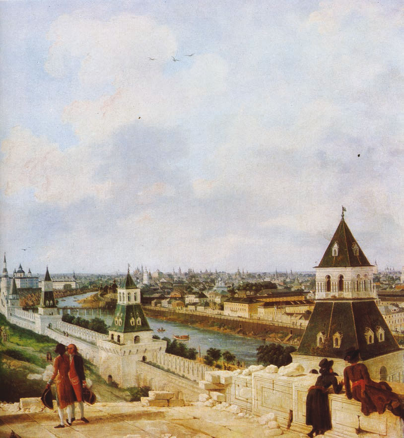 …Богатые вельможи, важные дворяне ездили в огромных высоких каретах с откидными лесенками у дверец. Сзади на запятках стояли, держась за ремни, два огромных гайдука, два ливрейных лакея, а на подножках, по одному у каждой дверцы, по казачку. На их обязанности было бегать в подъезды с докладом о приезде, а в грязную погоду помогать гайдукам выносить барина и барыню из кареты на подъезд дома. Карета запрягалась четверней цугом, а у особенно важных особ – шестерней. На левой, передней, лошади сидел форейтор, а впереди скакал верховой, обследовавший дорогу: можно ли проехать? Вдоль всей Садовой, рядом с решетками палисадников, вместо тротуаров шли деревянные мостки, а под ними – канавы для стока воды. Особенно непроездна была Самотечная и Сухаревские Садовые с их крутым уклоном к Неглинке.
