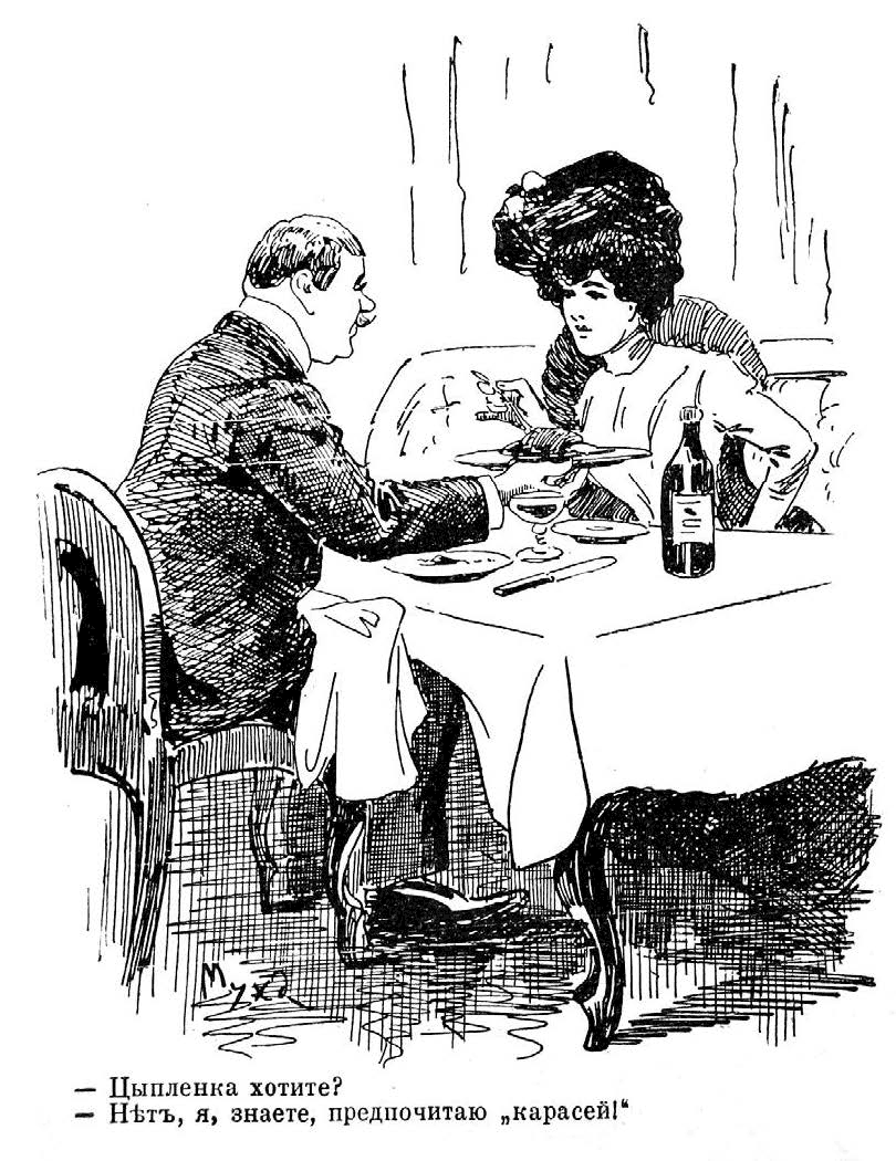Не таков был его однофамилец, с большими рыжими усами вроде сапожной щетки. Его никто не звал по фамилии, а просто именовали: Паша Рыжеусов, на что он охотно откликался. Паша тоже считал себя гурманом, хоть не мог отличить рябчика от куропатки. Раз собеседники зло над ним посмеялись, после чего Паша не ходил на «вторничные» обеды года два, но его уговорили, и он снова стал посещать обеды: старое было забыто. И вдруг оно всплыло совсем неожиданно, и стол уже навсегда лишился общества Паши.