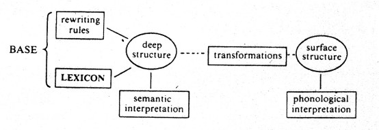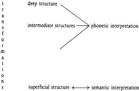 Единицы лексикона, соединенные по определенным правилам, образуют высказывание на уровне глубинной структуры, получающее там семантическую интерпретацию, и затем, также по определенным правилам, трансформируются в высказывание на уровне поверхностной структуры, получая там уже фонологическую интерпретацию[19].