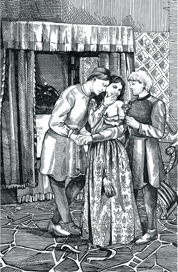 Как уже было сказано, красотка стремительно очаровала Арканжелло и вслед за ним Батисто. А когда опьяненные влюблённостью юноши начали смотреть друг на друга недобрым взглядом соперника, Розалина дала им понять, что у честной замужней женщины никому предпочтения нет и быть не может, а посему в один прекрасный вечер в её постели чудесным образом оказались сразу двое изголодавшихся по женской ласке молодых мужчин.