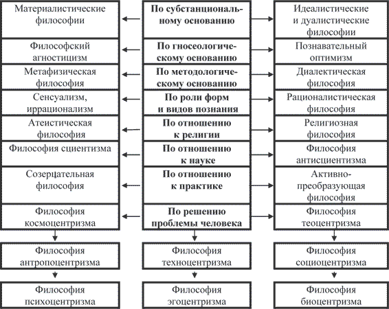 По субстанциональному основанию (субстанция – то, что лежит в основе мироздания, от лат. substantia – сущность; то, что лежит в основе) философские системы делятся на материалистические и идеалистические. Первые из них кладут в основу мироздания материально-вещественные элементы, вторые – объективные или субъективные духовные начала. Все они представлены великими творцами и многочисленными философскими школами. Так, материалистическая философия нашла выражение в системах французских материалистов XVIII века – Л. Фейербаха и К. Маркса. Философия объективного идеализма представлена Платоном, Августином и Г. В. Ф. Гегелем, а субъективного идеализма – Д. Беркли и ранним И. Фихте.