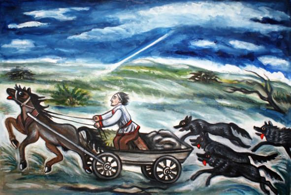 Suddenly Nazar noticed that a pack of wolves was rapidly approaching him from the side of the hills from a wooded gully. These wolves were almost twice the size of those whom he had ever seen in his life. Their fur stood on end, their eyes, bloodshot, glowed in the dark with bright red lights, and huge fangs were visible from their grinning mouths with tongues hanging to one side. Nazar stood up in the cart at full height and with his hands trembling with fear and horror began to shake the reins and shout to the horse:
