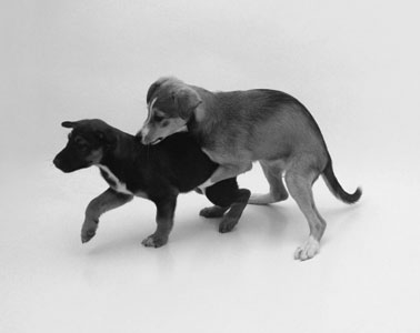 Поведение собак четвертой серии, т. е. выросших в полной изоляции, также было резко нарушено: самцы наскакивали на самку исключительно сбоку, ставя передние лапы ей на спину, и в этом положении совершали копулятивные движения.