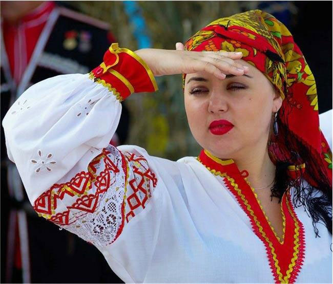 Из-за кулис вышла гарна дивчина в вышиванке с караваем «хлеб-соль» на подносе. Каравай был понадкусан по всему кругу, но