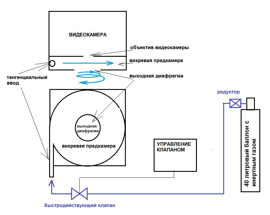 Предложенная предкамера представляет собой резервуар с симметричными диафрагмами и тангенциальным входом для газа. Быстродействующий управляющий клапан и редуктор позволяют формировать короткие регулируемые импульсы газа, создающие мощный вихрь и зону повышенного давления перед объективом, препятствующую попаданию загрязняющих веществ.