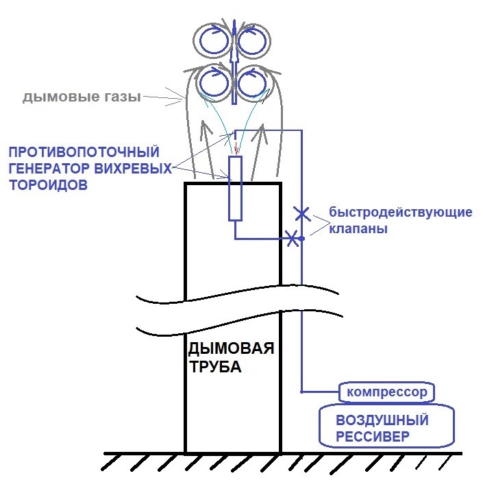 На выходе дымовой трубы монтируется генератор вихревых колец в виде системы из двух противопоточных патрубков. Высота установки генератора над выходом дымовой трубы должна быть равна диаметру вихревого кольца. Это условие обязательно для целей недопущения искусственного повышения тяги в печи за счёт эжекционных процессов формирования вихревых тороидов. Патрубки запитаны от воздушного компрессора с ресивером через быстродействующие клапаны, которые управляются так, что обеспечивается формирование следующих друг за другом полноценных вихревых тороидов с ротацией и само выворачиванием внутрь к оси распространения. Расход воздуха должен обеспечивать формирование вихревого тороида, диаметром, меньшим, чем внутренний диаметр печной трубы.