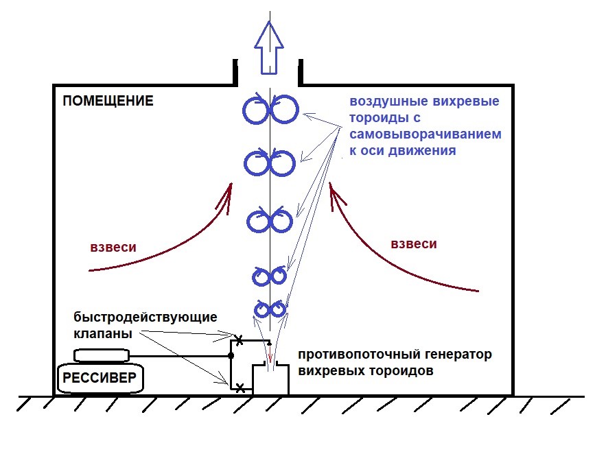 Предлагается принципиально новый способ очистки воздуха в помещении за счёт удаления взвесей с помощью высокоэнергетических, последовательно формируемых вихревых тороидальных структур, распространяющихся вертикально – от пола к потолку.