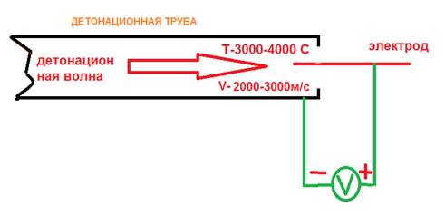 Таким образом можно представить волну детонационного горения как частично ионизированный газ, который является источник упорядоченного периодического движения носителей электрического заряда в заявленном случае. Значит детонационно-электрический эффект – явление образования электродвижущей силы между двумя проводниками, размещёнными в направлении фронта детонационной волны частично ионизированного газа детонационного горения топливовоздушной смеси.
