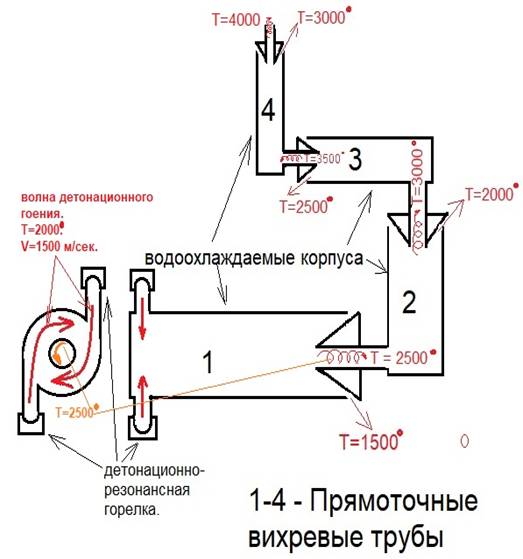 Всего четыре ступени, см. рис. № 9. Четыре прямоточные вихревые трубы соединены последовательно по схеме “горячий выход – следующий вход”. Первая ступень запитана от источника следующих друг за другом волн детонационного горения с температурой 2000 градусов и скоростью 2000 м/сек. На “горячем” выходе первой ступени температура внутреннего вихревого потока будет 3000 градусов. В каждой ступени температура повышается на 1000 градусов.