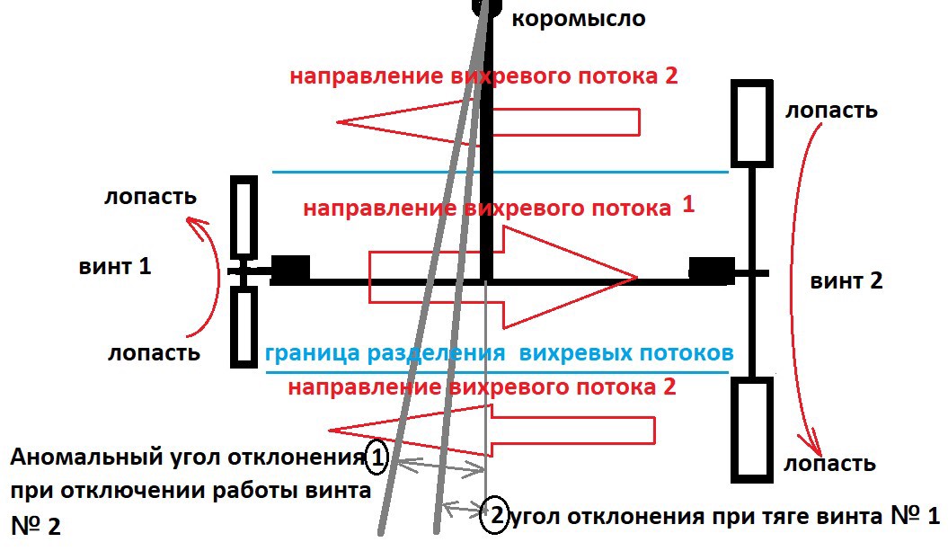 В момент прекращения формирования, например, наружного вихревого потока – коромысло отклонится на аномальный угол № 1, значение которого более чем в два раза большее угла тяги только одного винта № 1, см. рис. № 10 и 11.