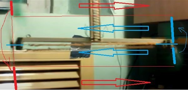 Система двух воздушных винтов, разнесенных друг от друга на подвешенном коромысле, формирует два встречных коаксиальных вихревых потока – один в другом с одинаковой тягой. Особенность формирования встречных коаксиальных вихревых потоков такова, что они не направлены навстречу друг другу, а распространяются коаксиально один в другом в разных направлениях. Между внутренним и внешним противовихревыми потоками формируется цилиндрическая зона изменений давлений (на рис. № 10. указана синим цветом).