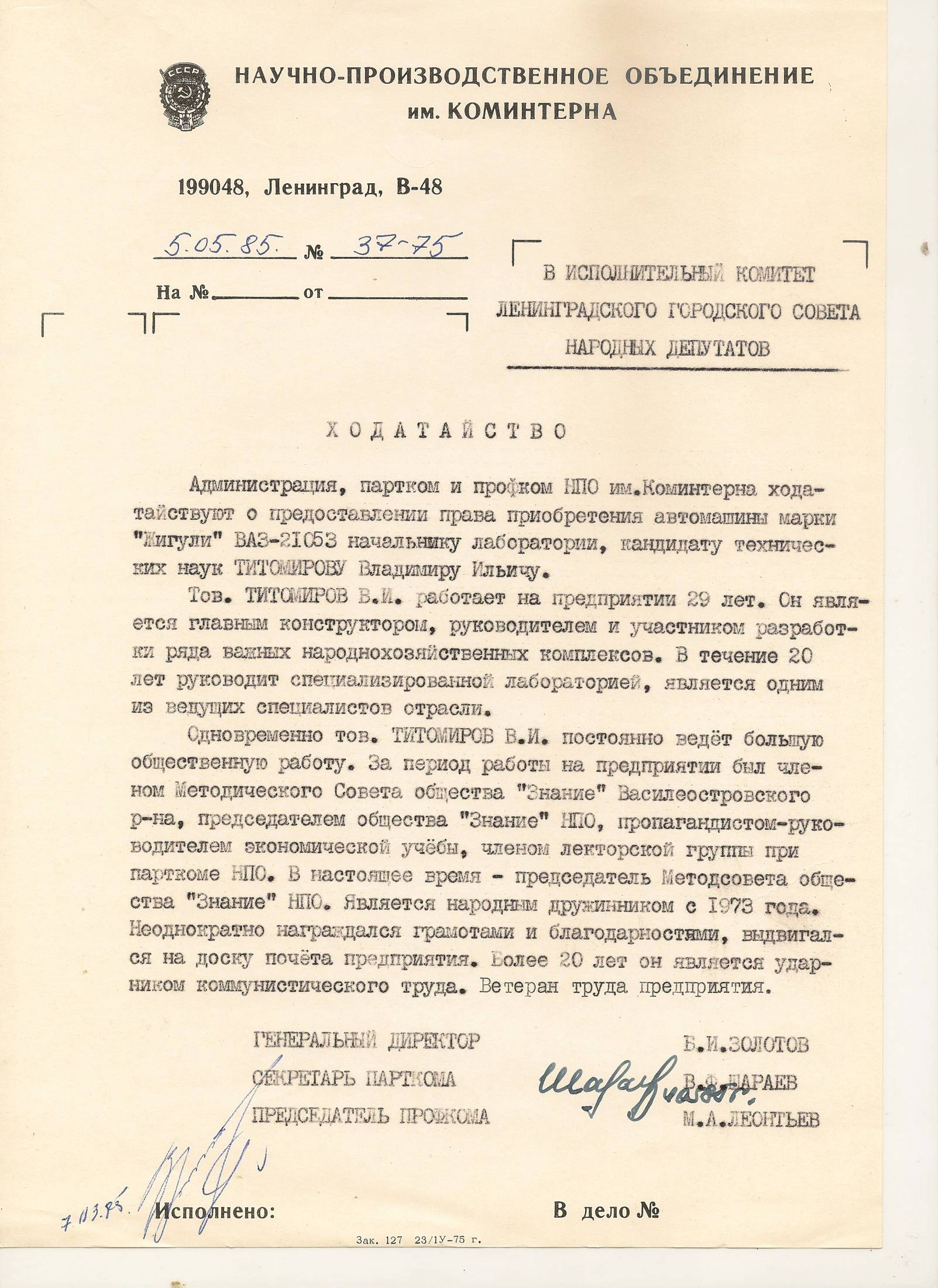 Далее приведено ходатайство Владимиру на получение автомашины. одной, выделенной для предприятия, характеризующее его уникальность, по мнению руководства предприятия. Из него видно, что здесь, в этой книге, некоторые его качества не упомянуты. Поэтому это ходатайство заслуживает особого внимания. Решиено всё оставить, как есть. Прочтите его внимательно !