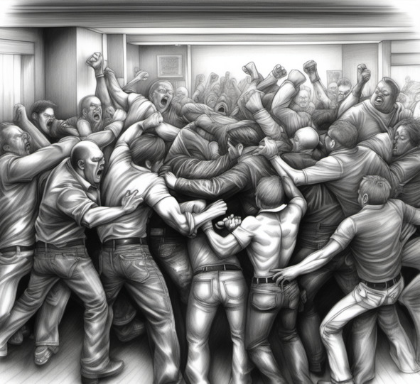 С криками «наших бьют!» в драку впряглась половина бара. Другая половина присоединилась лишь на мгновение позже. Мордобой – явление естественное в подобных питейных заведениях, но всё же не такое массовое. Дрались все против всех. Уже неважно было, кто зачинщик и кто на чьей стороне. Процесс принял стихийный характер, где был каждый сам за себя.