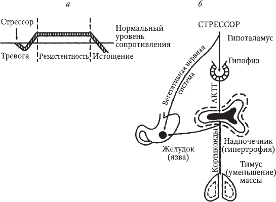 Рис. 2. Три фазы общего адаптационного синдрома (а) и основные пути формирования стресс-реакции (б) (по: Селье Г.)