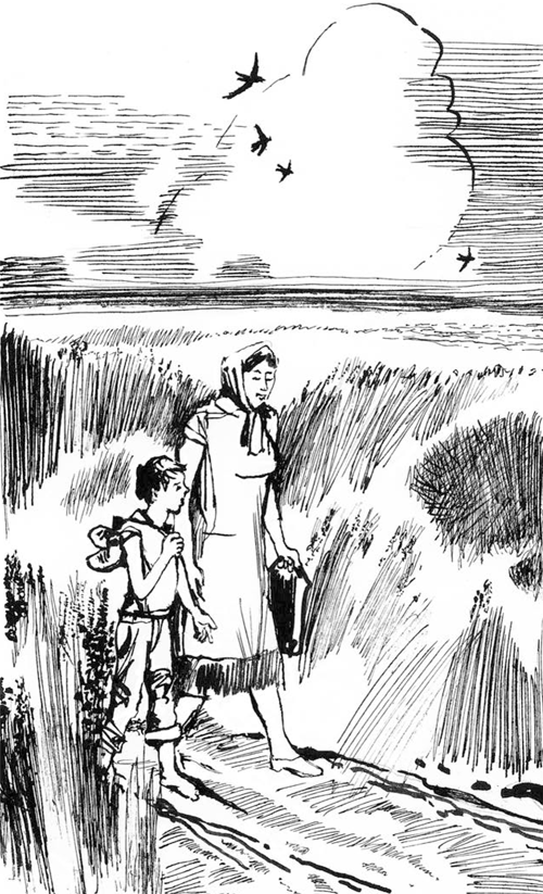 И снова они идут молча. Только скрипит тяжёлая корзинка: мать все чаще перебрасывает ее с руки на руку.