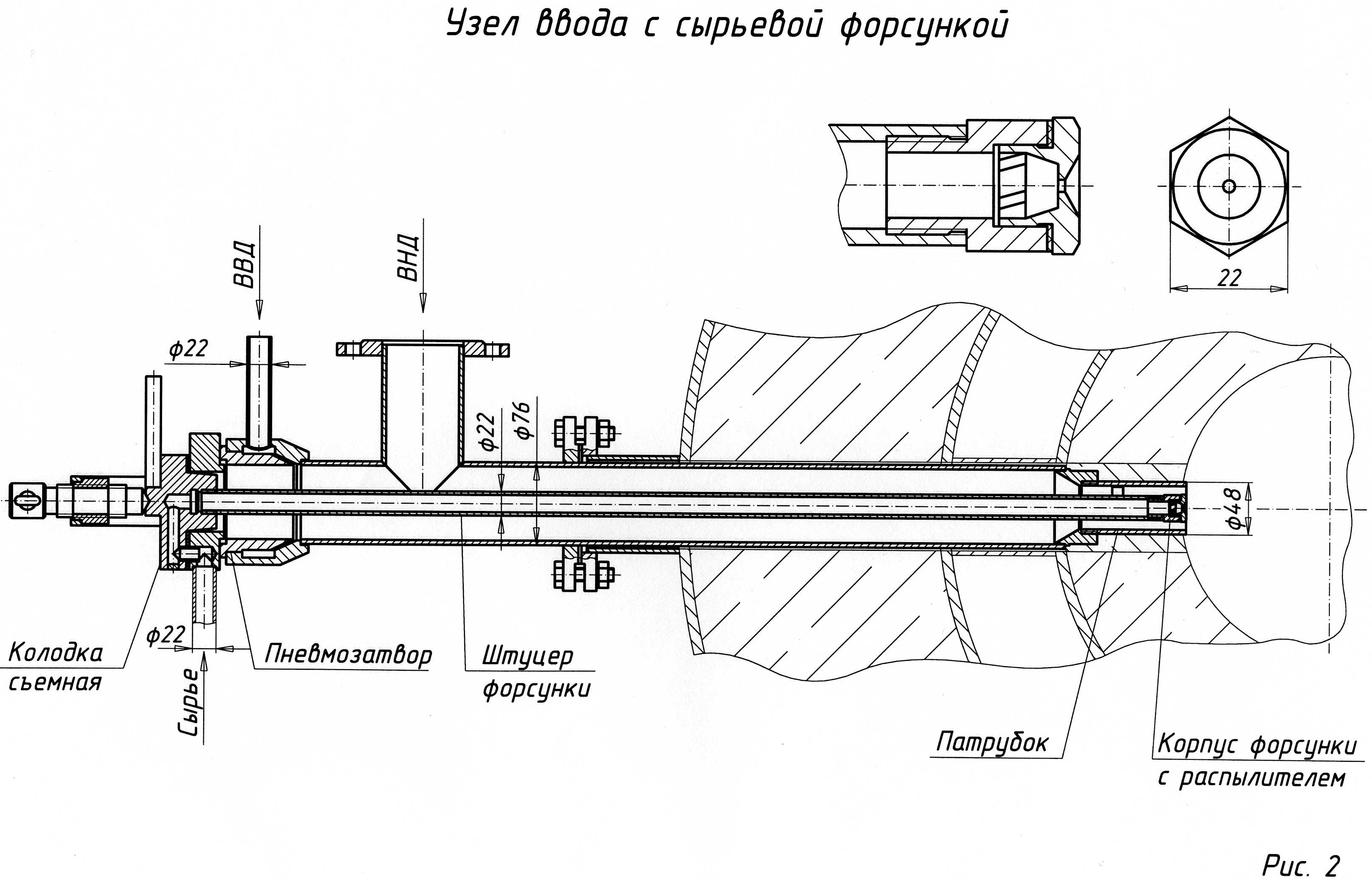 На рис.2 показан узел ввода сырья в реактор с сырьевой форсункой. Важным элементом узла ввода является его патрубок диаметром 48мм, смонтированный заподлицо (вровень) со смесительным соплом реактора. Корпус сырьевой форсунки должен располагаться вровень с патрубком узла ввода, как это показано на рис.2. Патрубки узлов ввода диаметром 48мм. (применяются и патрубки D=42мм.) изготавливаются из жаропрочной стали 15Х25Т, выдерживающую температуру до 1000⁰С. Корпус и распылитель сырьевой форсунки также должны изготавливаться из жаропрочной стали, однако обычно они изготавливаются из стали 12Х18Н10Т, которая выдерживает температуру только до 750⁰С., что, естественно, сокращает срок службы форсунки. Продолжительность работы форсунок без замены зависит и от расхода сырья в реактор. Чем больше сырья поступает в форсунку, тем меньше вероятность забивания и закоксовывания распылителя и выходного отверстия форсунки.