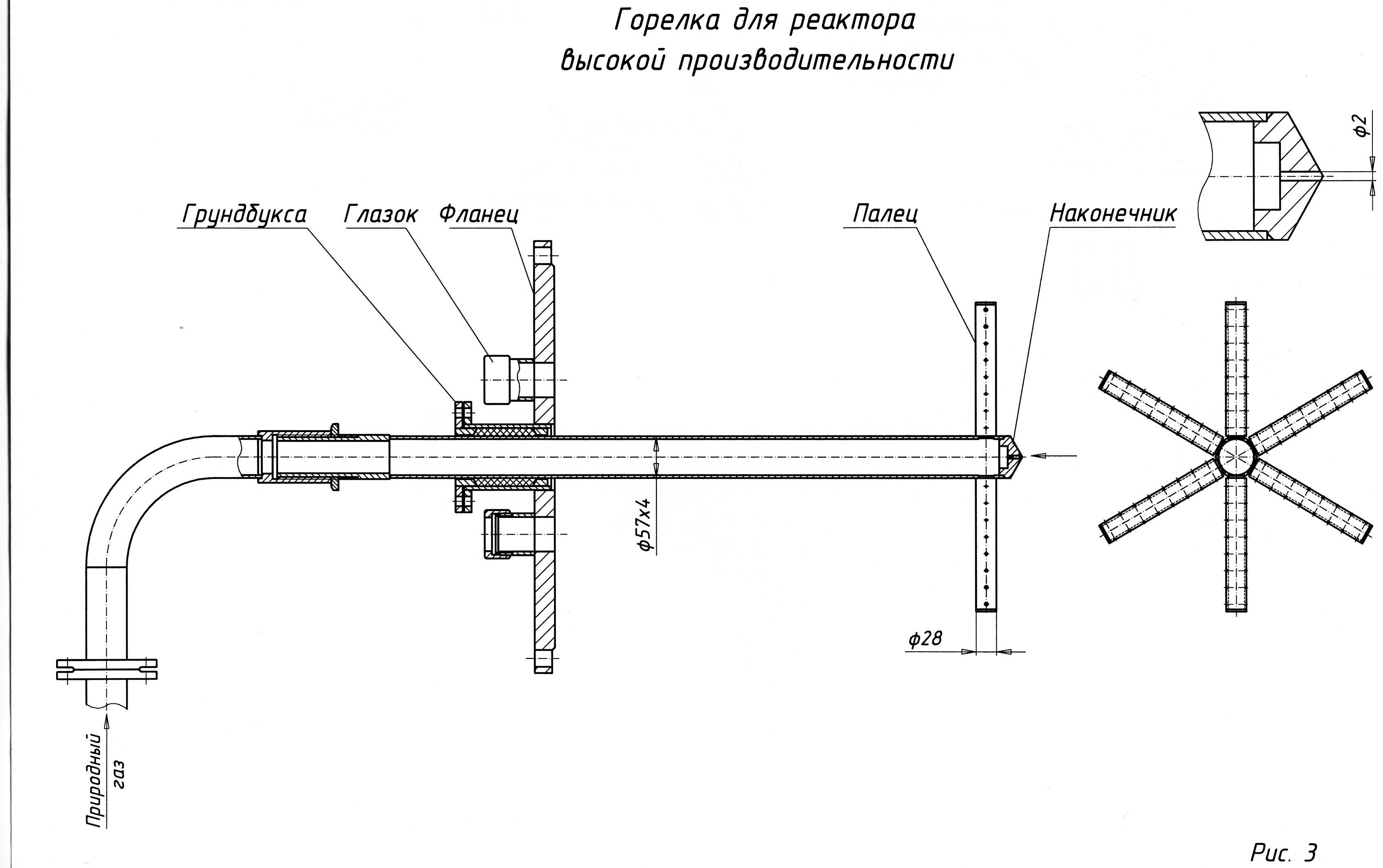 Общий вид горелки для реакторов высокой производительности (4500—5000кг/час) показан на рис.3. Природный газ по трубе диаметром 57мм. поступает к пальцам горелки и через отверстия в них распределяется равномерно по сечению горелочного туннеля камеры горения, где интенсивно перемешивается с горячим воздухом и сгорает. Пальцы в количестве шести штук расположены равномерно по окружности и представляют собой заглушенные с торца трубы диаметром 28мм. с отверстиями. В каждом пальце имеется по 8 сквозных отверстий различного диаметра(от2,0 до 4,2мм.) Важное значение имеет наконечник, назначение которого заключается в предотвращении обгорания торца газовой трубы. Горелки должны изготавливаться из жаропрочной стали марки 15Х25Т, которая может выдерживать температуру до 1100⁰С. Однако, на заводах, применяющих эти горелки они, как правило, изготавливаются из стали 12Х18Н10Т с температурой применения до 800⁰С., что значительно снижает их надёжность, увеличивая вероятность прогара горелок как в процессе их эксплуатации, так и при остановке реакторов. После каждой остановки реактора горелку необходимо заменить, так как после прекращения подачи газа и воздуха горелка подвергается воздействию высокотемпературной воздушной среды камеры горения, что обычно приводит к прогару металла элементов горелки. Как показывает практика, к особо опасным последствиям приводит прогар конуса горелки. В этом случае основная часть газа поступает в горелочный туннель непосредственно по трубе, полноценного смешения газа и воздуха не происходит и горение смещается в коническую часть камеры горения реактора, что может привести к растрескиванию циркониевых огнеупоров и сокращению срока их службы. Возможно в отдельных случаях смещение фронта горения в смесительное сопло реактора, что наиболее опасно, так как это может привести к оплавлению огнеупоров, находящихся непосредственно за циркониевыми блоками. Обычно в таких случаях при неизменных расходах газа и воздуха температура в камере горения понижается на 30-80⁰С. При наличии таких изменений необходимо остановить реактор и заменить горелку. При прогаре горелки площадь её проходного сечения увеличивается и при одном и том же расходе газа давление газа перед горелкой снижается. Величина падения давления зависит от степени прогара металла горелки, Но определить её можно всегда, сравнивая аналогичные режимы работы реактора в данное время и предыдущие периоды. Удостоверившись в понижении давления газа перед горелкой при неизменном расходе газа необходимо заменить горелку. Повышение давления газа перед горелкой при постоянном расходе газа указывает на то, что часть отверстий пальцев забита. Это может привести к прогару металла отдельных пальцев горелки. При повышении давления газа перед горелкой выше регламентной нормы горелку тоже нужно заменить. Следует отметить, что эта горелка используется в отрасли длительное время. Конструкция горелки разработана ещё ВНИТУ. Недостатки этой горелки указаны выше. На некоторых заводах, например, Ярославском и частично Омском используются и другие конструкции горелок, но они не обеспечивают хорошего смешения газа и воздуха. Для разработки более совершенной горелки необходимо сотрудничество со специализированными организациями, занимающимися процессами сжигания то