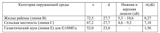 В таблице для примера приведены коэффициенты только для тех категорий окружающей среды, в которых размещаются приемные центры. В таблице также приведены децили коэффициента шума относительно медианного значения и соответствующие среднеквадратические отклонения, рассчитанные по формуле (22) для верхней децили.