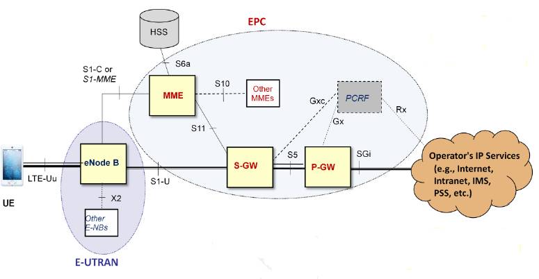 Сеть включает в себя мобильные терминалы (UE – User Equipment), сеть радиодоступа E-UTRAN (Evolved Universal Terrestrial Radio Access Network)и новое ядро сети Evolved Packet Core (EPC). Для обслуживания абонентов сеть имеет выход на сети с предоставлением услуг по IP-протоколу и на домашние сети абонентов (HSS – Home Subscriber Server).