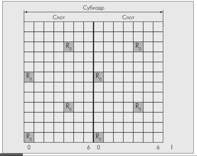 Опорный сell-specific-сигнал должен присутствовать в каждом субкадре нисходящего канала (кроме случаев MBSFN-передачи). Форма сигнала определяется на основе псевдослучайной последовательности Голда (вариант m-последовательности), при инициализации которой используется идентификационный номер ячейки БС (Cell ID). Такой опорный сигнал равномерно распределен по ресурсным элементам (рис.13). Так, при стандартной длине префикса он транслируется в 0-м и 4-м OFDM-символе, при расширенном СР – в 0-м и 3-м OFDM-символе. В частотной области опорные сигналы передаются через каждые шесть поднесущих, причем смещение определяется идентификатором ячейки, взятым по модулю 6.
