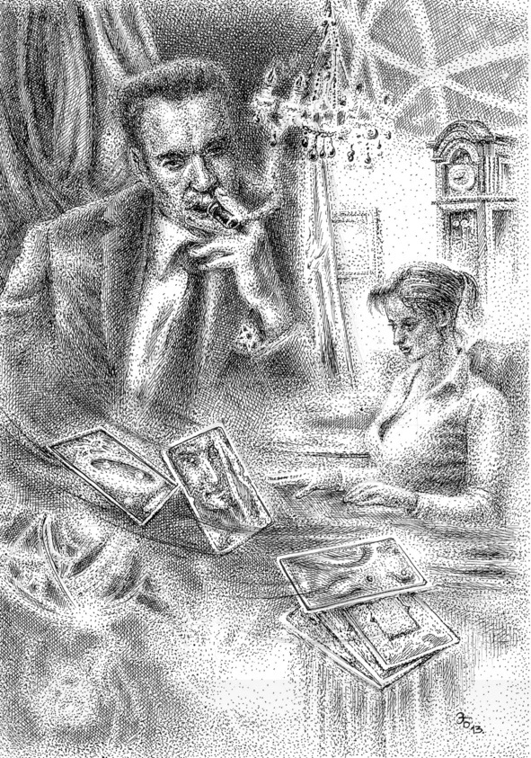 За спиной девицы веером расходились четыре белые двери с простыми круглыми металлическими ручками. Единственным цветовым пятном не в черно-белой гамме была картина в простенке меж дверьми. А единственным предметом, намекавшим на принадлежность офиса к оккультному миру, служила колода карт Таро на столе секретарши.