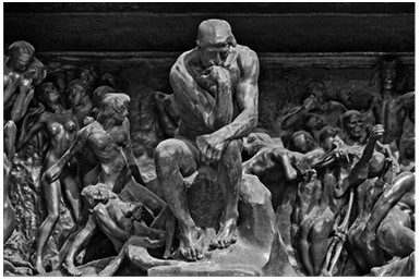 Изначально скульптура в виде сидящего сгорбившегося человека должна была стать центральной фигурой в работе Родена «Врата ада». А образы «Врат ада», как известно, идут из дантовского «Ада». Причем стоит, наверно, подчеркнуть понимание Роденом Данте как «мыслителя на все времена», поэтому работать в его парадигме могли только писатели столь же мощной мыслительной насыщенности.