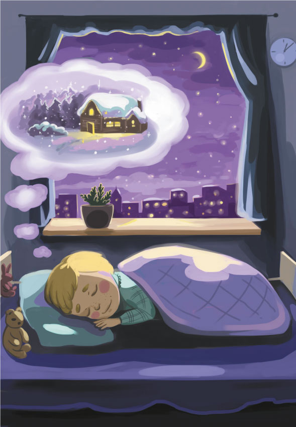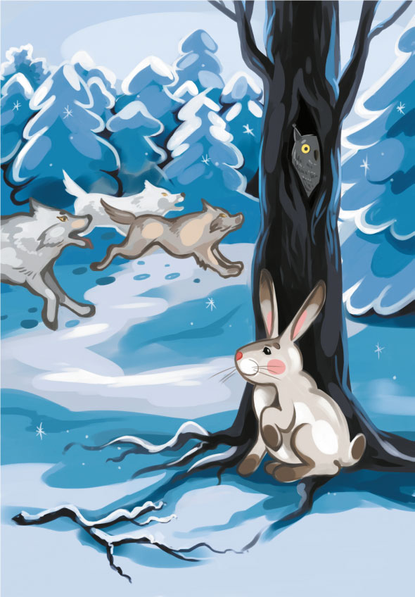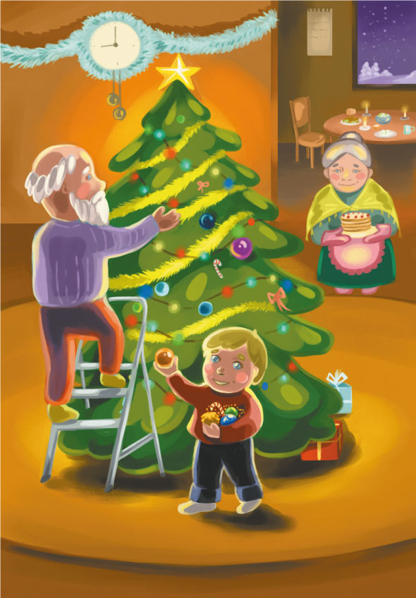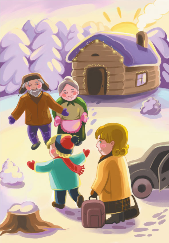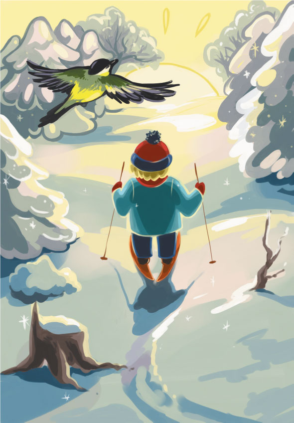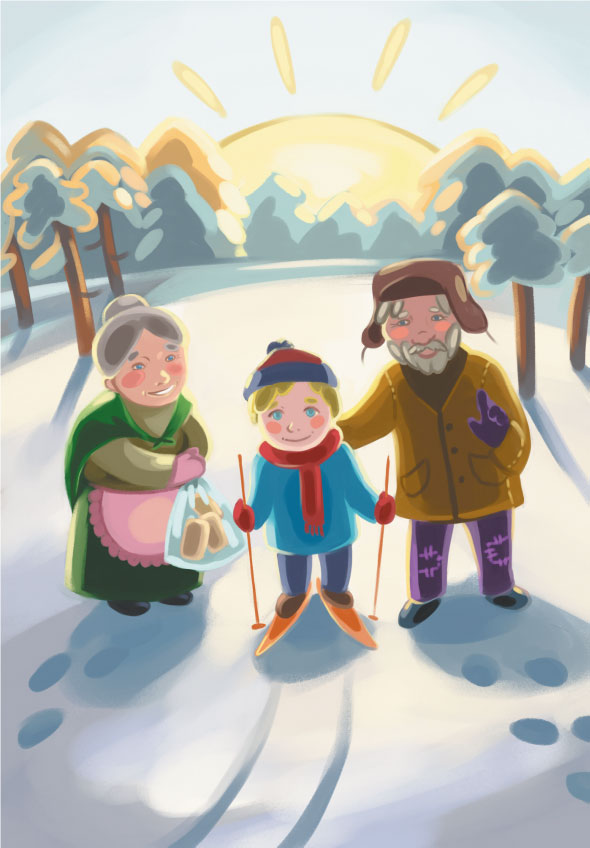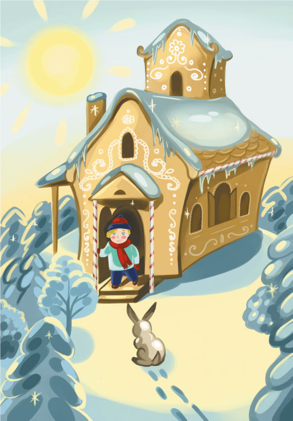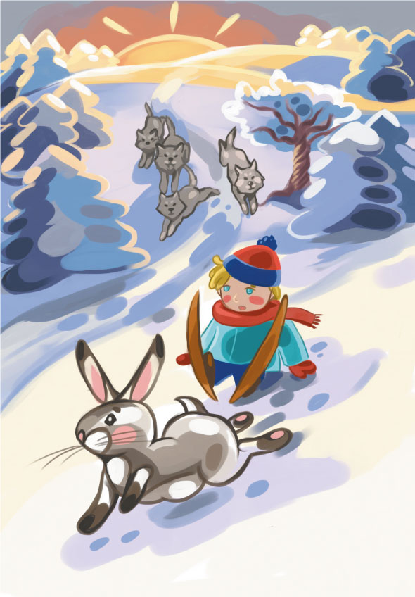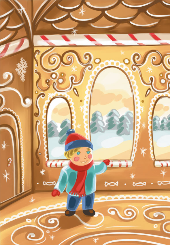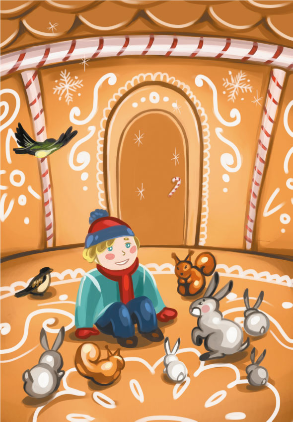 Зима-зимушка пришла,Много снега принесла,Разукрасила лесаИ укутала поля.Кругом чисто и бело:Наступало Рождество!Мальчик Рома долго ждалЭто время, он мечтал…Даже видел ночью сон,Что попал в чудесный дом!Вот – исполнилось желанье:Уже город позади,А деревня – впереди!Дед с бабулей в ожиданьеВ доме за столом сидятИ в окошечко глядят.Мама Рому в деревенькуНа машине привезлаИ сыночка на неделькуДеду с бабой отдала.В доме завертелось вдруг,Всё вихрем закружилось,Ёлка в шесть умелых рукБыстро нарядилась!Дед гирлянды к потолку ловко прикрепляет,Бабушка на кухне сдобы выпекает.Рома сноп овса для птиц на сугроб поставилИ в кормушки семечек и хлебушка добавил.Овсянки и синички сразу прилетели,Видно, что проголодались после злой метели…Корм пичуги, прыгая, весело клевалиИ что-то непонятное громко щебетали.Рома радостный, довольный тем, что пташкам угодил,Яблоню с кормушками гирляндой нарядил!Снег искристый и пушистый красотой своей манил,Дед для Ромы по размеру лыжи, палки снарядил.Давняя мечта мальчишки прокатиться по лыжнеДа набрать немного шишек, чтоб развесить во дворе,Стала явью – он на лыжах неуверенно стоит,«Ты на палки упирайся», – дед Роману говорит.Бабушка несёт пакетик: «Вот, возьми, внучек, с собой,Здесь три пряника с глазурью и с начинкой не простой,Голод быстро утоляют, телу силы придают,На морозе согревают, мысли умные дают.Если же беда какая вдруг с тобой произойдёт,Крикни: «Пряник, помоги мне!» – помощь сразу же придёт».А Роман им напоследок: «На край леса лишь пойду,Быстренько вернусь обратно, никуда не пропаду!»Дед с бабулей помахали лыжнику малому вслед,С хрустом снега услыхали: «Ждите, я вернусь!» – в ответ.Рома шёл и наслаждался зимней сказочной красой,Белым снегом любовался, солнечных лучей игрой!Вдруг синичка прилетела, стала что-то щебетать,Шапку крылышком задела, Рома же не мог понять,Что ей нужно, что случилось, почему так закружиласьПташечка вокруг него. Оглянулся – никого…Только – ой! Ой-ой! Ой-ой! За огромной за сосной!Заяц белый! Ух, косой!Одно ухо пригибает, а другим смешно вращает,Думает, что не видать! Рома – в лес, с ним поиграть!Потихонечку, на лыжах, крадучись, к сосне идёт,Ну, а зайчик-поскакайчик хвостиком смешно трясёт,Рома думает: «Трусишка, ведь спокойно же вокруг».Лишь подумал – хруст, рычанье, жуткий вой раздался вдруг.Присмотрелся: в снежном вихре волчья стая к ним бежит,Из больших клыкастых пастей пар как из трубы валит,И бегут к нему навстречу, и глаза у них горят,Дыбом шерсть: сейчас настигнут, во мгновение съедят!Рома струсил не на шутку, смотрит: заяц поскакал.Он – за ним! За ним по следу что есть силы побежал!И кричит: «Ой, заяц, заяц, погоди – и я с тобой!»Оглянулся – волчья стая гонится за ним гурьбой!Заяц в гору, Рома тоже, только очень нелегкоПо глубокому по снегу подниматься высоко!Лыжи задом в снег съезжают, палки в стороны летят,Рома в страхе горько плачет: «Ой, сейчас меня съедят!»Он уже рычанье слышит разъярившихся волков,И упал, и тяжко дышит, и в висках стучится кровь,Сил уж нет, близка кончина!!! Но припомнились слова:«Крикни: «Пряник, помоги мне!» – коль придет к тебе беда!»Рома с хрипом сил последних крикнул: «Пряник, помоги!»И он тут же оказался в тёплом домике, внутри!«Что такое происходит? Ничего я не пойму,Что это за превращенья, я во сне иль наяву?»Рома с мыслями собрался, стал подро