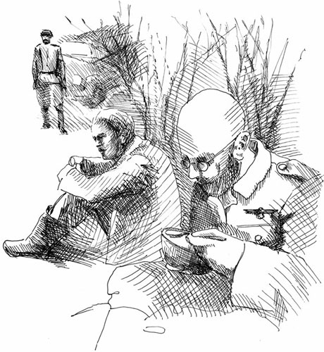 Из немцев ближе всех к нему присел молоденький лейтенант. Правая рука его висела на привязи и была по локоть в кровавых бинтах. Левой он неумело держал ложку и пытался захватить кашу из котелка. Немцы расположились прямо на дороге, и поэтому, когда по ней собрался проехать легковой автомобиль, многим пришлось встать и отойти в сторону. Их примеру собрался последовать и раненый лейтенант, но вдруг споткнулся и выронил из единственной здоровой руки котелок. Каша вывалилась на землю.