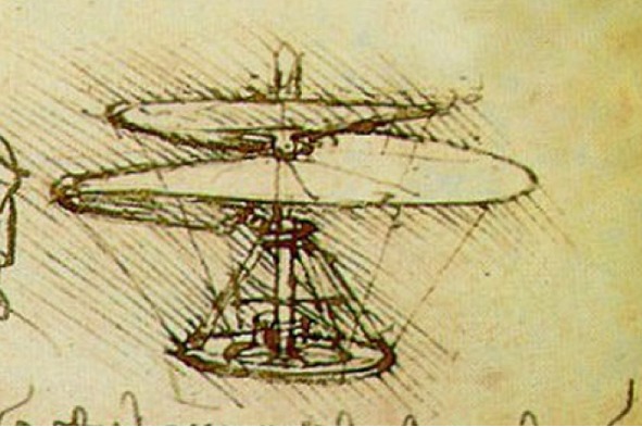 На первом рисунке изображена машина с двумя винтовыми поверхностями на вертикальном валу. Ясно, изобретатель хотел получить подъемную силу за счет вращения крыльев. Это – идея геликоптера, созданного в наш век.