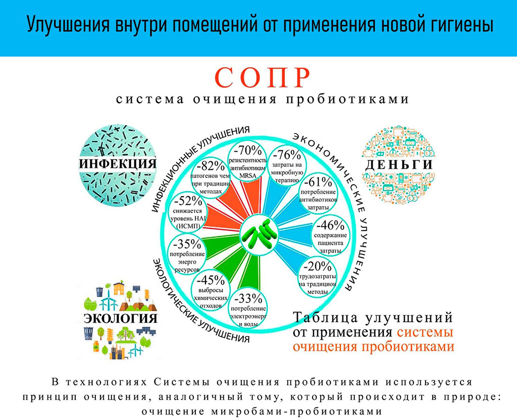 Каждый пациент должен знать, что уже существует Система очищения пробиотиками (СОПР), которая позволяет эффективно и бюджетно получать на практике инфекционные улучшения, экологические улучшения, экономические улучшения.