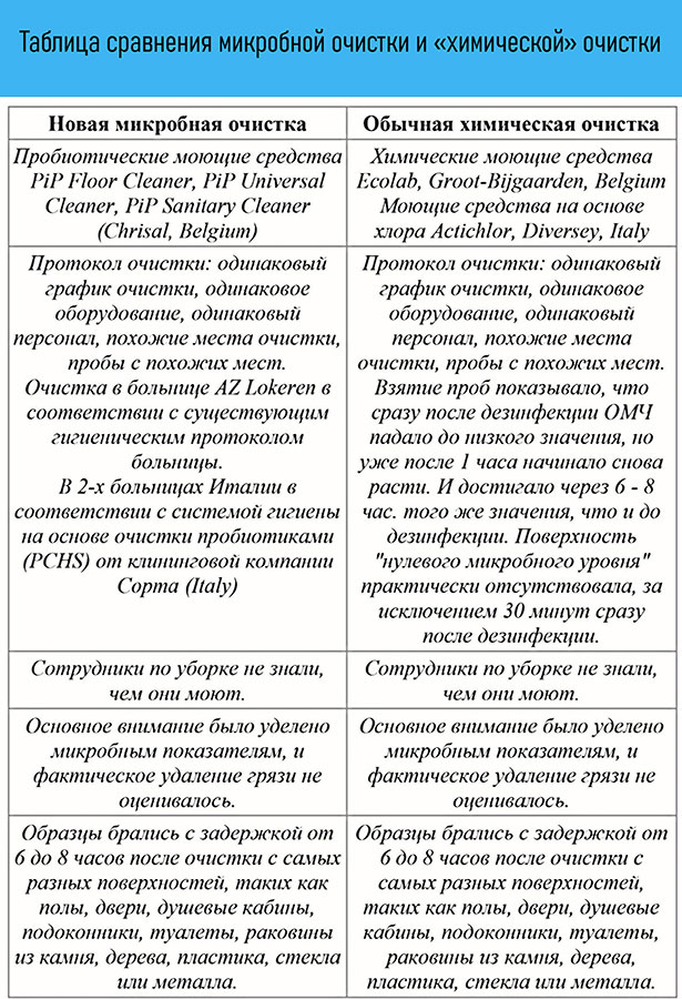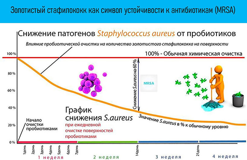 Дезинфекция и новая гигиена. Несмотря на редуктивный эффект для нескольких микроорганизмов, связанных с HAI, микробные чистящие средства не должны использоваться или рассматриваться как дезинфицирующие средства. Действительно, когда поверхность активно загрязнена, необходима дезинфекция, особенно для тех поверхностей, которые расположены в зонах повышенного риска. Очистка пробиотическими продуктами может преодолеть ограниченное действие традиционных дезинфицирующих средств путем уменьшения повторного появления патогенных нагрузок на поверхности и удаления биопленок, которые могут служить убежищем для других патогенов. Продукты на основе пробиотика, используемые в этом исследовании, пригодны только для очистки. Когда дезинфекция действительно необходима, нужно использовать дезинфицирующее средство, но комбинация с очисткой на основе пробиотиков позволит обеспечить оптимальное долгосрочное поддержание низких уровней загрязнения. Учитывая недавнюю и быструю эволюцию резистентных патогенов в медицинских учреждениях, существует потребность в устойчивых и эффективных альтернативах химическим средствам и дезинфекции, используемым сегодня.