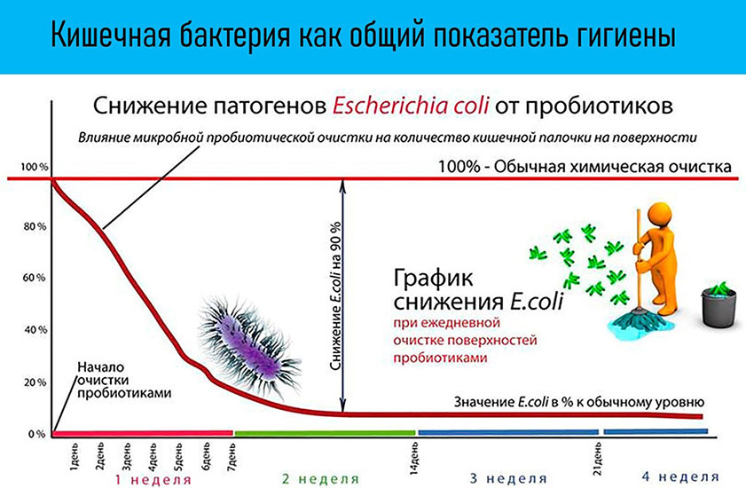 2) Что микробная (пробиотическая) очистка более эффективна при долгосрочном применении. Обязательно наблюдается снижение количества микроорганизмов, связанных с HAI, на поверхностях по сравнению с обычными чистящими средствами, даже такими, которые содержат дезинфицирующие молекулы, такие как хлор.