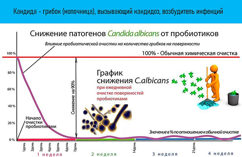 Candida albicansНагрузка Candida albicans регулярно измерялась в двух итальянских стационарных условиях. На рисунке показаны средние относительные значения уменьшения нагрузки. Микробная очистка привела к быстрому снижению нагрузки, что соответствует значению 82 ± 19 %, через неделю и далее численность C.albicans стабильно поддерживалась на низких уровнях в течение следующих недель.