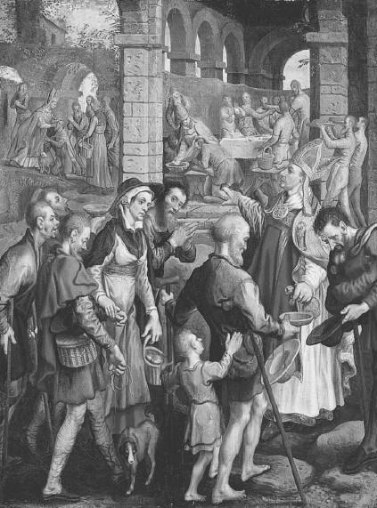 Пошёл правитель в церковь, набились и нищие в церковь, те, которые попали, а другие толпою стали перед церковью на площади. Слуги же в то время на площади столы расставили, и покрыли их, и поставили на них пироги, и похлебки, и мясо, и мёд, и вино. И сколько ни было нищих, всем места хватило.