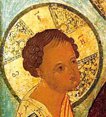 На иконе в нимбе над головой Иисуса Христа три старославянские буквы: ОТ, ОН и ИЖЕ восьмеричное, означающие 1370 год. Взято из http://st.rublev.com/icons/44/44-262-1355.jpg