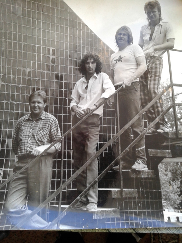 Погоняло дал ему Курзан, не помню в связи с чем. Шульман (внизу) играл на клавишах во Флаге. Он закончил консу, а вот по какому предмету?. Саша вечно попадал в какие-нибудь истории. В перестроечные годы мы вместе играли в ресторане Старая крепость. Туда частенько заходили жулики. Нас они не трогали, ну и мы держались от них на расстоянии.
