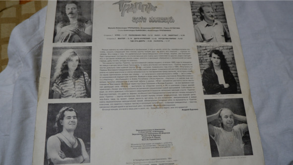 Интересно, что на конверте диска Траппа изображён какой-то старик, а на тыльной стороне фото музыкантов – участников коллектива, каждый в отдельности. Так вот слева три фотки по вертикали Трапа, я и Захаров, а справа Паша, Боря. Вася. А ведь альбом вышел в 1990 году задолго до их смерти.