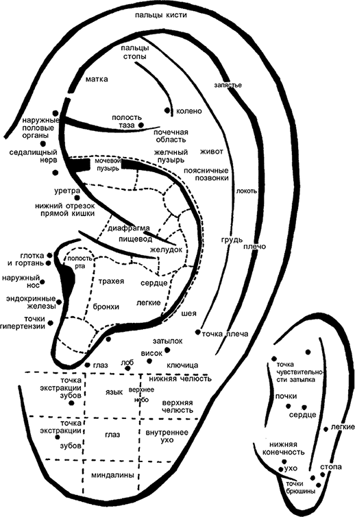 Проекции внутренних органов и частей тела на ушной раковине (по П. Ножье)