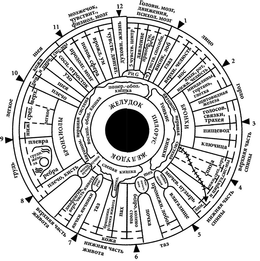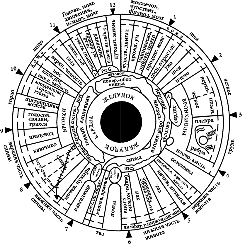 Кольцевая топография радужки (по Е. С. Вельховеру): 1 – парасимпатическая система; 2 – желудочная секреция; 3 – желудок; 4 – кишечник; 5 – позвоночник; 6 – магистральные сосуды, железы внутренней секреции; 7 – органы; 8 – мелкие сосуды, лимфатическая система; 9 – кожа
