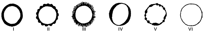 Наиболее типичные формы зрачковой каймы (B. Iensen, 1964): I – равномерно утолщенная; II – равномерно зернистая; III – ореолоподобная; IV – неравномерно утолщенная; V – неравномерно зернистая; VI – тонкая