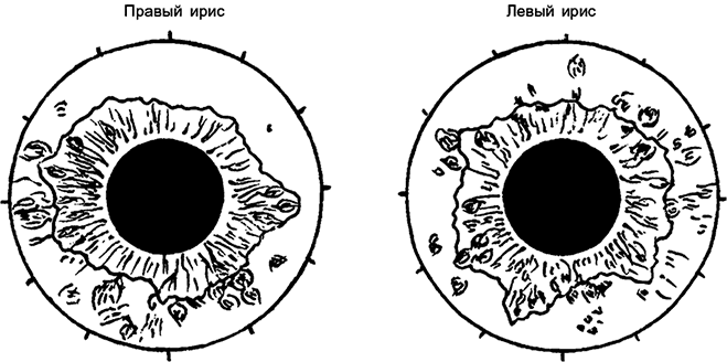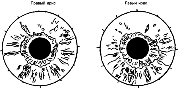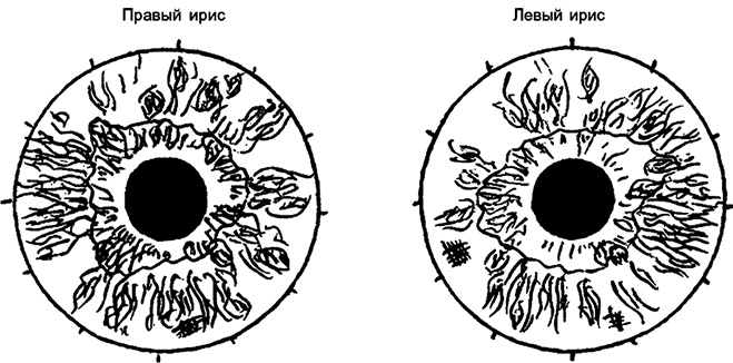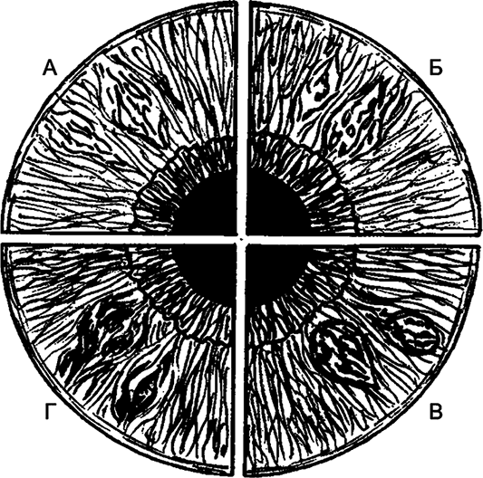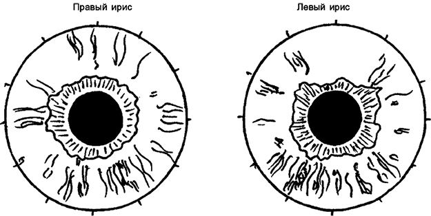 Каковы же специфические признаки общих нарушений в организме и частные проявления отклонений в различных органах и системах? На многие вопросы сможет ответить грамотный иридодиагност, используя имеющиеся схемы или работая по своей, индивидуальной, отточенной накопленным годами опытом.