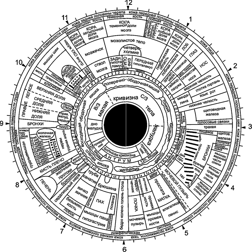 Схема проекционных зон тела человека на радужке – правый ирис (по B. Iensen, 1964)