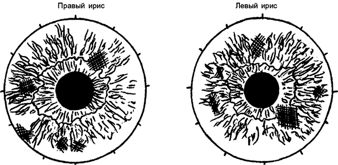 • Черно-коричневые пигментные пятна в различных областях радужки, в том числе в проекционной зоне печени.