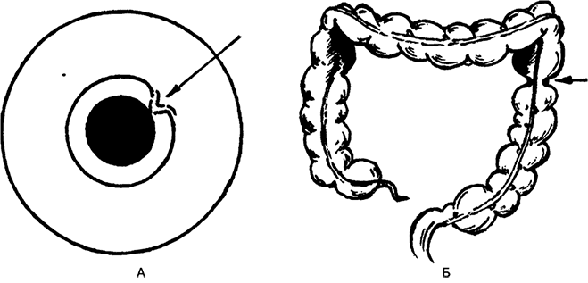 Тотальный дивертикулез ободочной кишки (B. Iensen, 1964): А – радужка; Б – толстая кишка